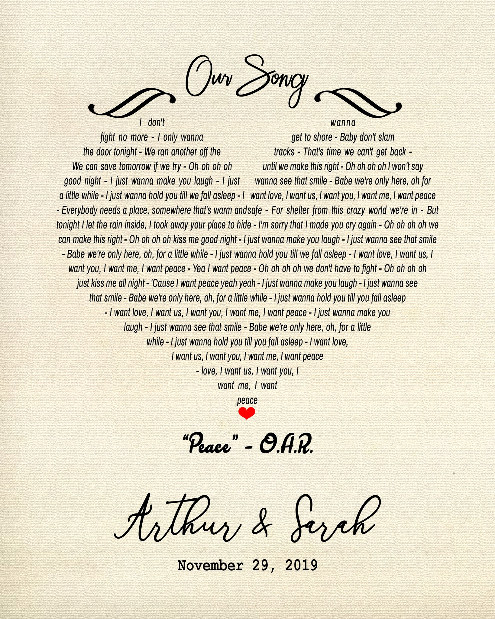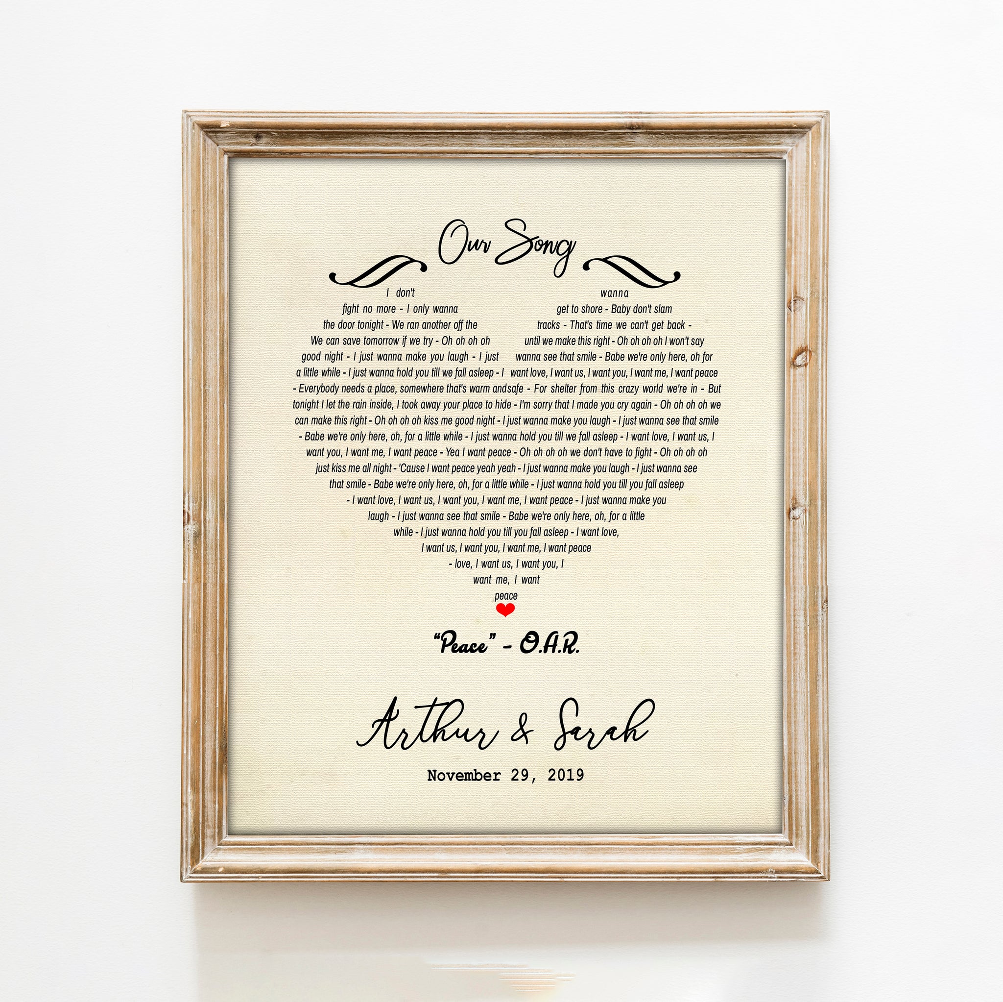 Song Lyrics Wall Art Print; a Personalized anniversary or wedding gift for couples. We make a beautiful wall art from your wedding song or your favorite song for your anniversary gift, a rustic Wall Art Print with a vintage feel. Personalized with names, song title, artist/band name and date.