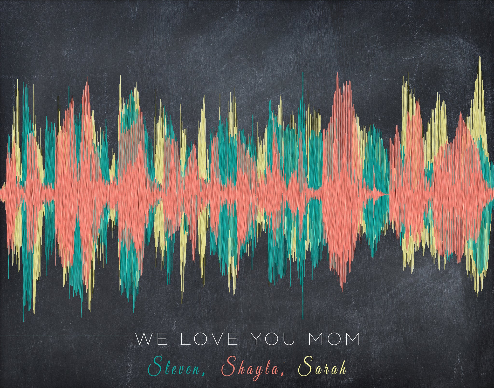 Custom Mother's Day Gift from kids. "We Love You Mom" Soundwave Art Print for Mothers Day. We turn your kids voice recordings and messages into a unique and meaningful sound wave art, then we add a little art work and print it on a fine art paper.