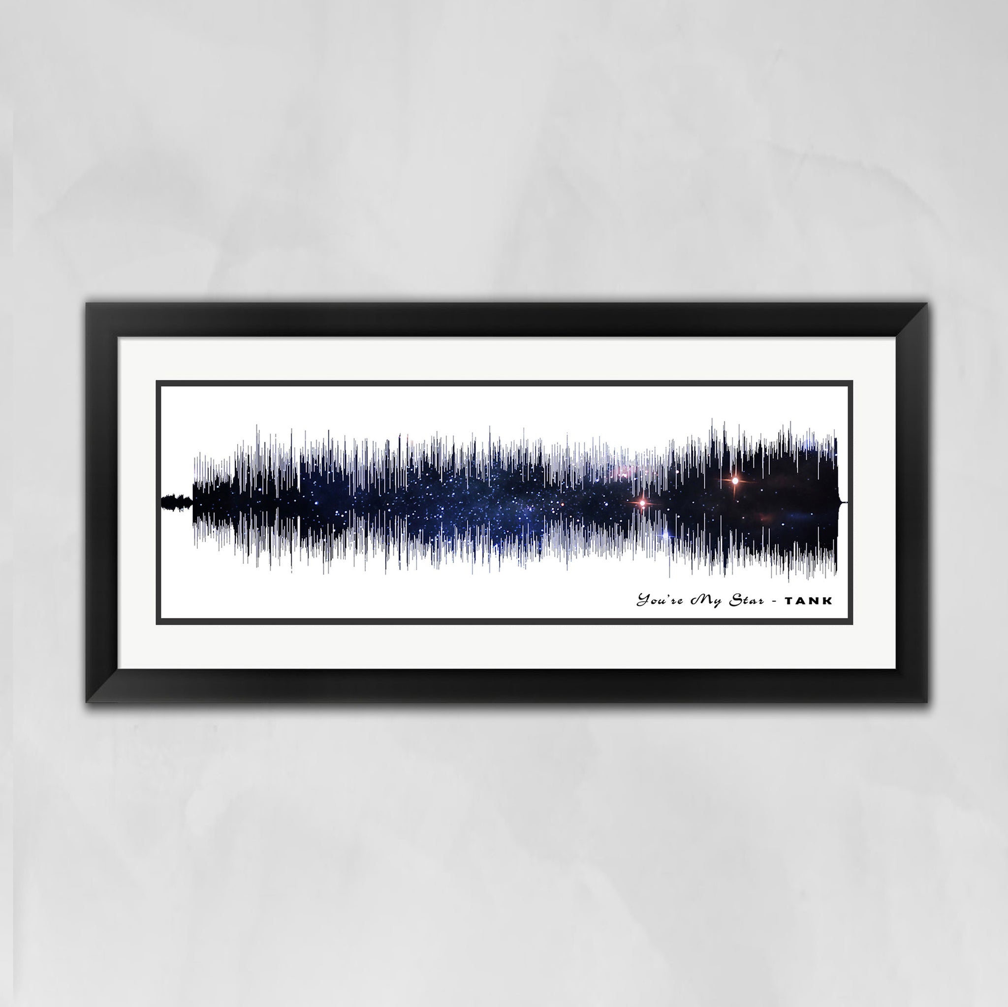 A unique personalized gift from your wedding song. We turn your favorite song into a sound wave print with a night sky background inside the wave. You can choose a night sky background from our chart, or you can send us your night sky background.