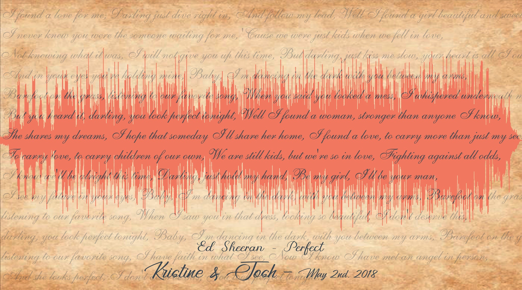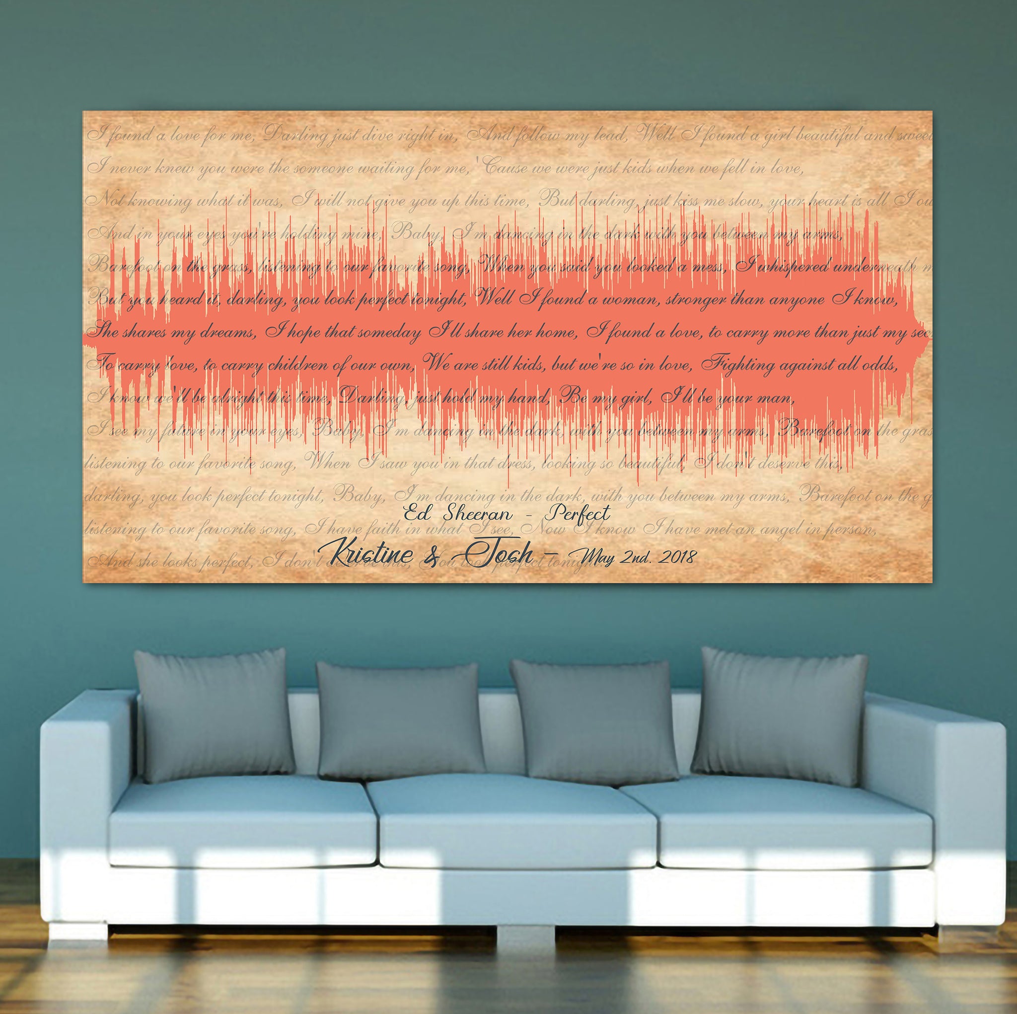 WEDDING SONG LYRICS GIFT FOR HUSBAND: We turn your wedding song or your first dance song into a beautiful sound wave art, printed on a premium fine art paper with the song lyrics on the sound wave. You can have it printed on a vintage paper background or a solid color background, with the notes or the lyrics.