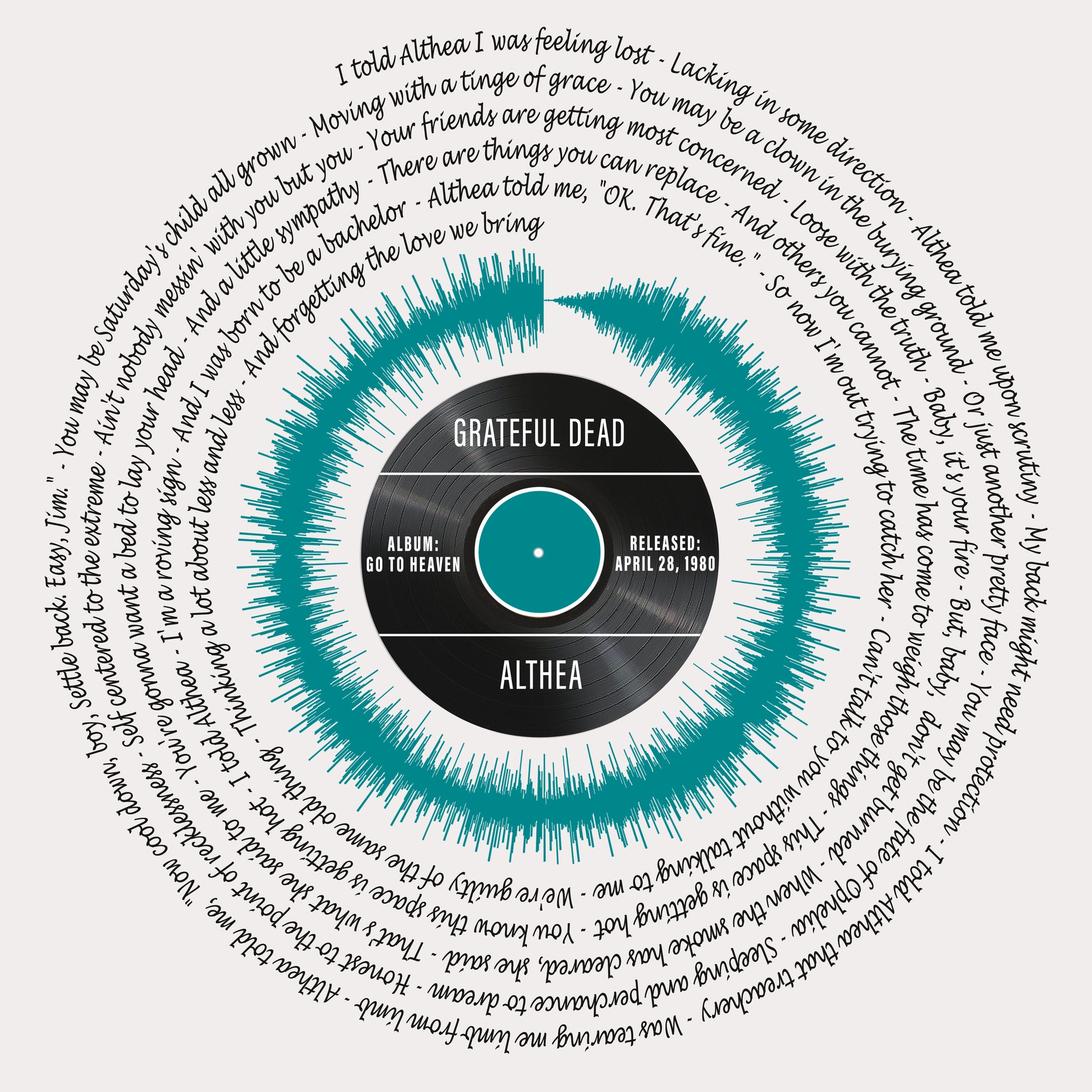 althea Lyrics - Grateful Dead - Althea Song Lyrics Wall Art; a soundwave art print from one of the Grateful Dead's best songs, with the song lyrics and the album art on a vinyl disc mock-up. We turn your wedding song, or your favorite song into a beautiful and unique anniversary gift. The perfect gift for your husband or boyfriend, a gift that will admire for years to come.